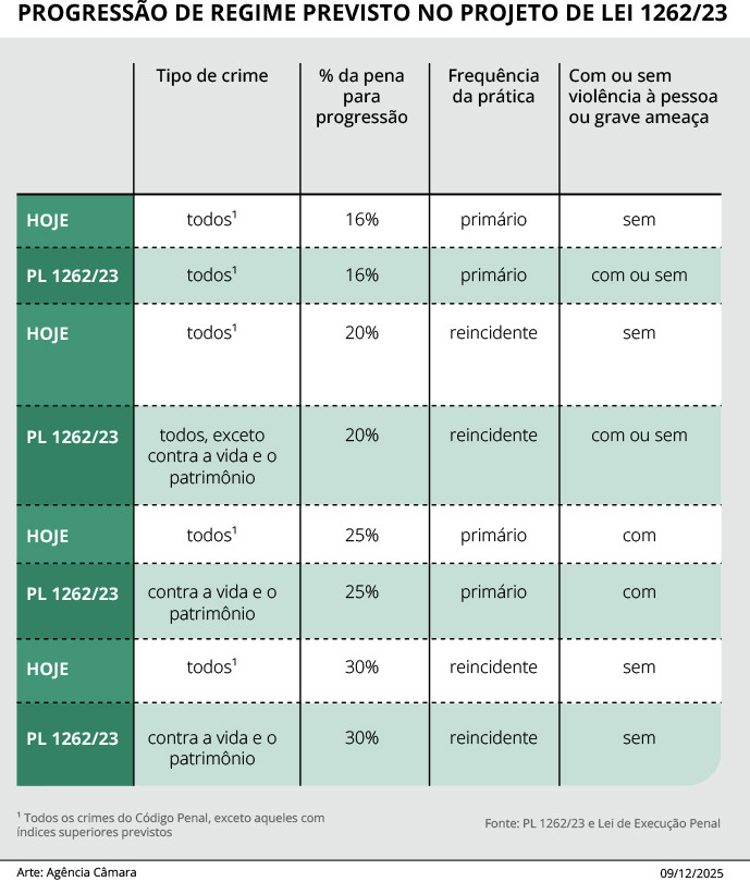 Sem a mudança, a progressão ocorreria apenas com o cumprimento de 25% da pena pelo réu primário. Para os reincidentes, o índice de cumprimento no regime fechado passa de 30% para 20%.