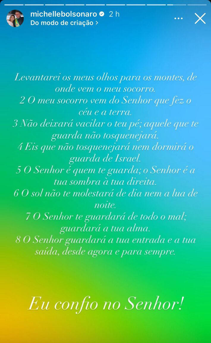 Na mesma mensagem, compartilhada nos stories, Michelle citou mensagem bíblica e utilizou tom religioso para se referir à prisão de Bolsonaro.