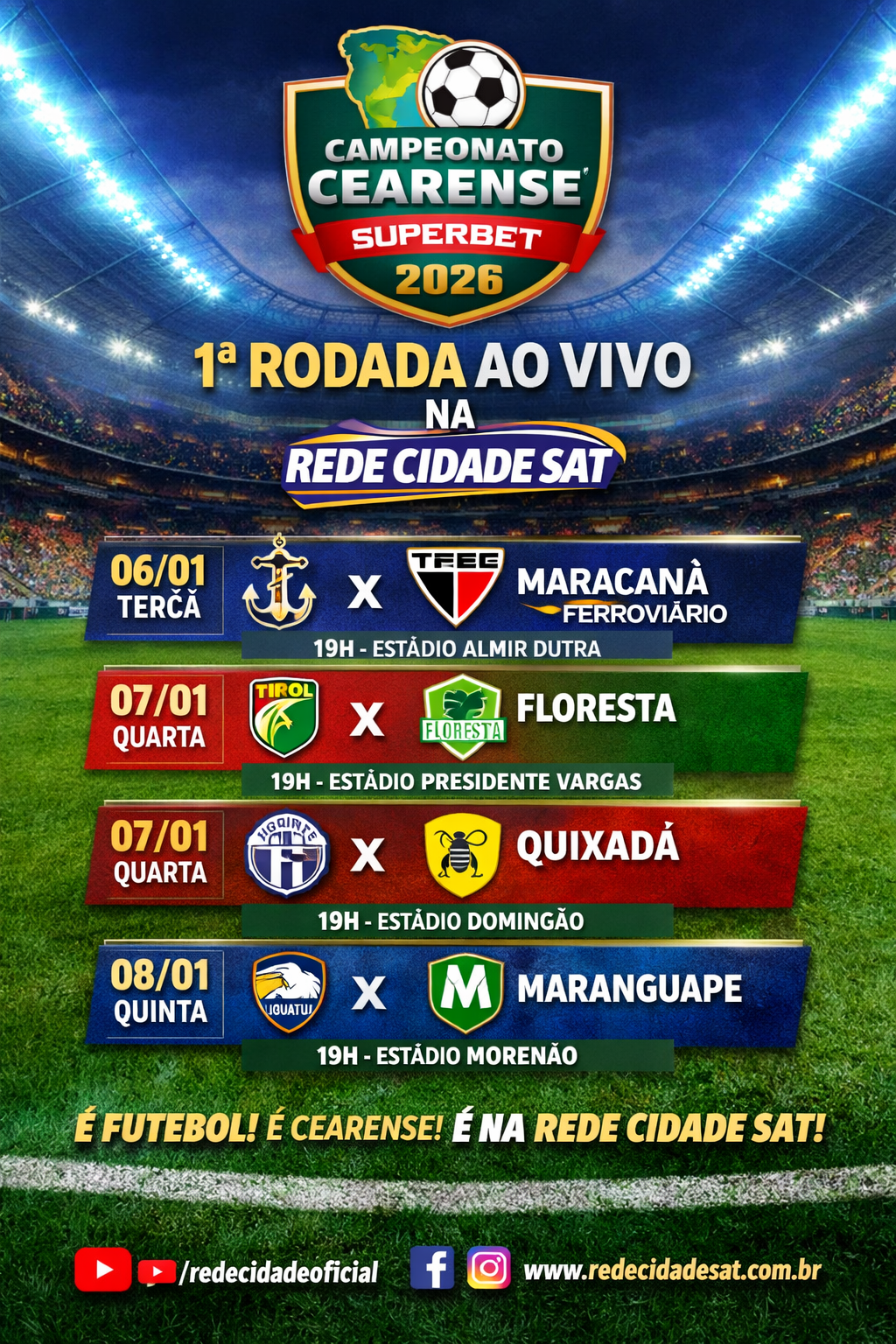 A Rede Cidade Sat confirma a transmissão ao vivo da primeira rodada do Campeonato Cearense 2026, levando ao público toda a emoção do futebol estadual com qualidade, credibilidade e ampla cobertura jornalística.