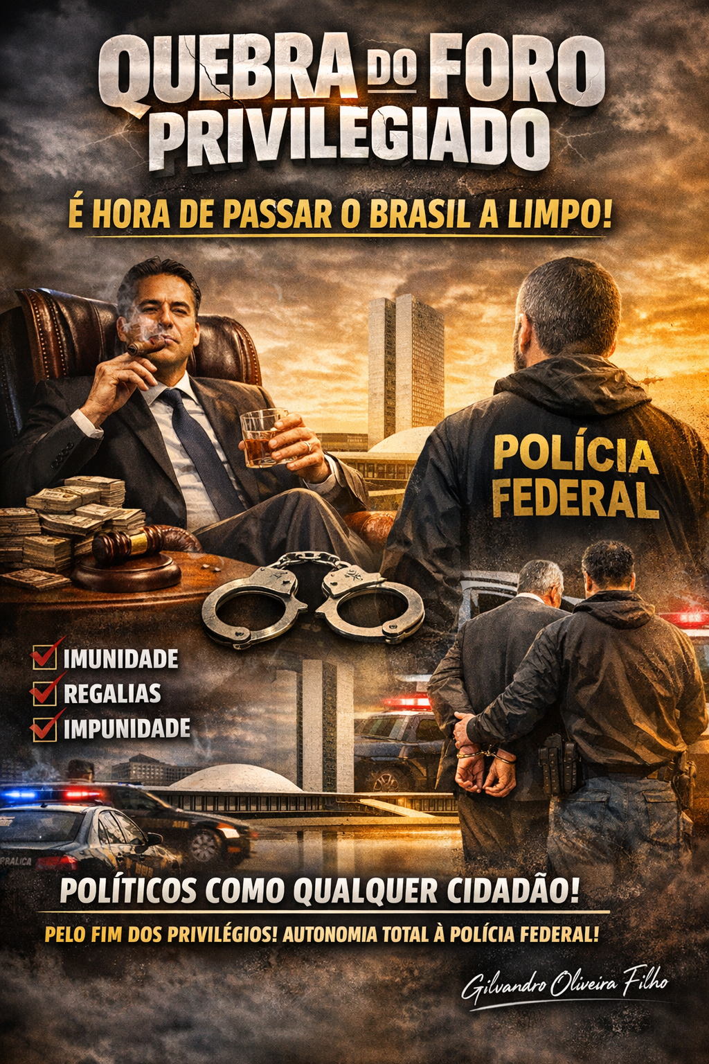 Quando a política tem tudo e o povo quase nada, a democracia adoece. O foro privilegiado, como existe hoje, virou escudo pessoal. Quebrá-lo é afirmar que ninguém está acima da lei. Dar autonomia à Polícia Federal é garantir que a verdade não seja engavetada. Passar o Brasil a limpo é uma escolha coletiva — urgente e possível.