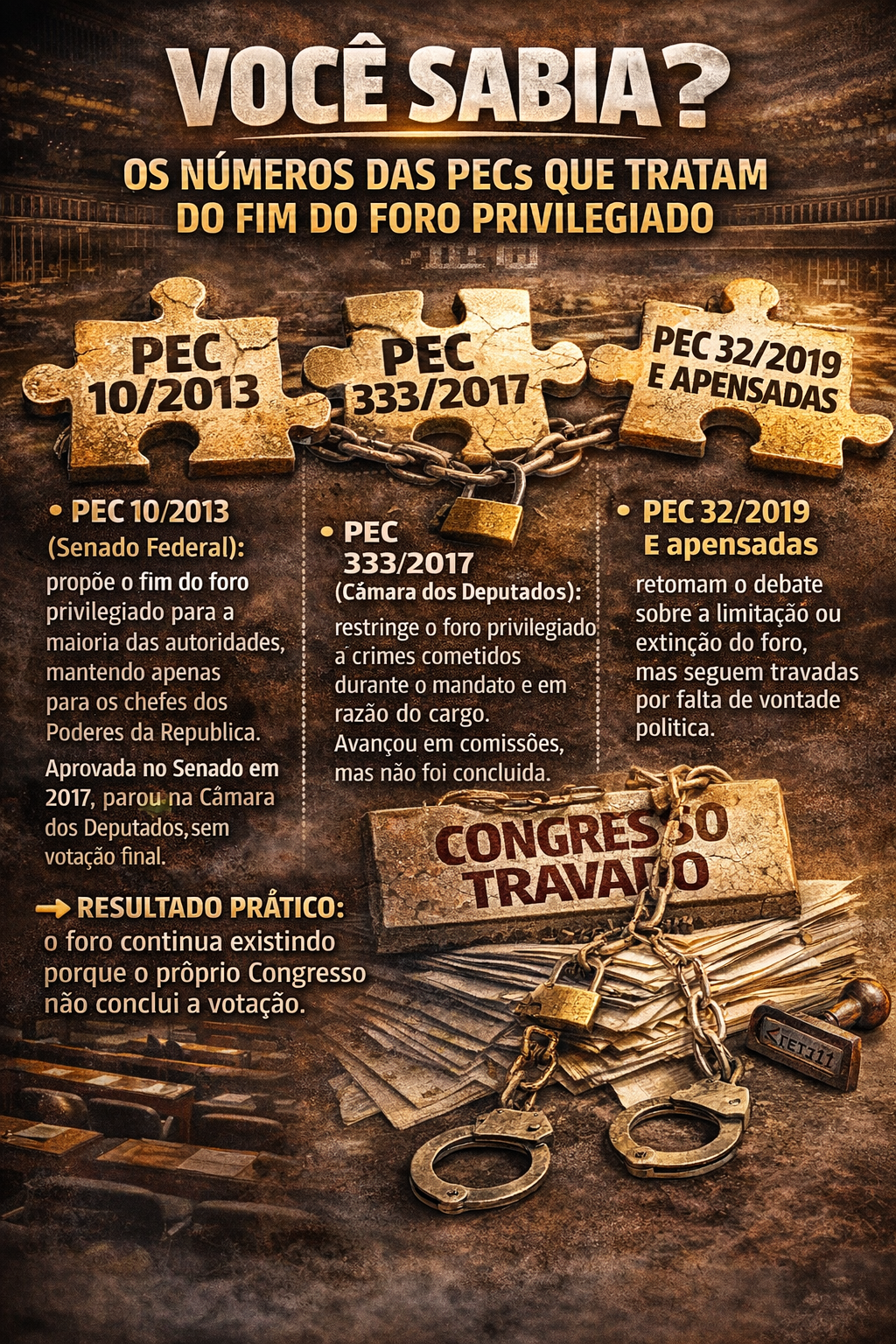 Especial de Domingo — O foro privilegiado tornou-se um dos maiores símbolos da desigualdade jurídica no Brasil. Enquanto autoridades são julgadas em tribunais superiores, o cidadão comum enfrenta a Justiça na primeira instância. Nesta matéria especial, explicamos o que é o foro privilegiado, quem tem direito a ele, o que parlamentares podem fazer amparados por esse mecanismo e como a sua quebra pode ajudar a passar o país a limpo. O editorial também detalha, passo a passo, como aprovar a mudança por meio de uma PEC e defende a autonomia total da Polícia Federal como instrumento essencial no combate à corrupção e à impunidade. Uma análise clara, didática e direta sobre por que a política tem muitos direitos e o povo quase nenhum — e como mudar essa realidade.