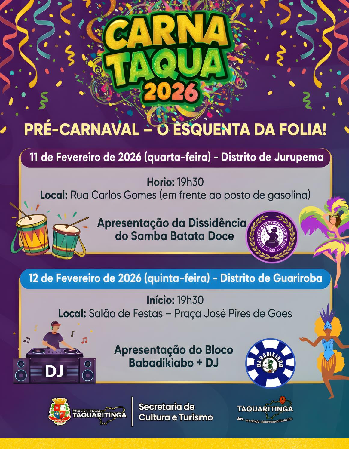 A Prefeitura de Taquaritinga, por meio da Secretaria Municipal de Cultura e Turismo, anuncia a realização do Carna Taquá 2026, o pré-carnaval que antecipa o clima de festa e leva música, cultura e alegria aos distritos do município.